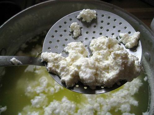 Поставьте молоко на средний огонь в кастрюле, достаточно большой, чтобы молоко, поднявшись, не убежало. Пока молоко нагревается, приготовьте свёртывающее вещество и дуршлаг, выстелив его двумя слоями марли и поставив на сосуд для стекания сыворотки.